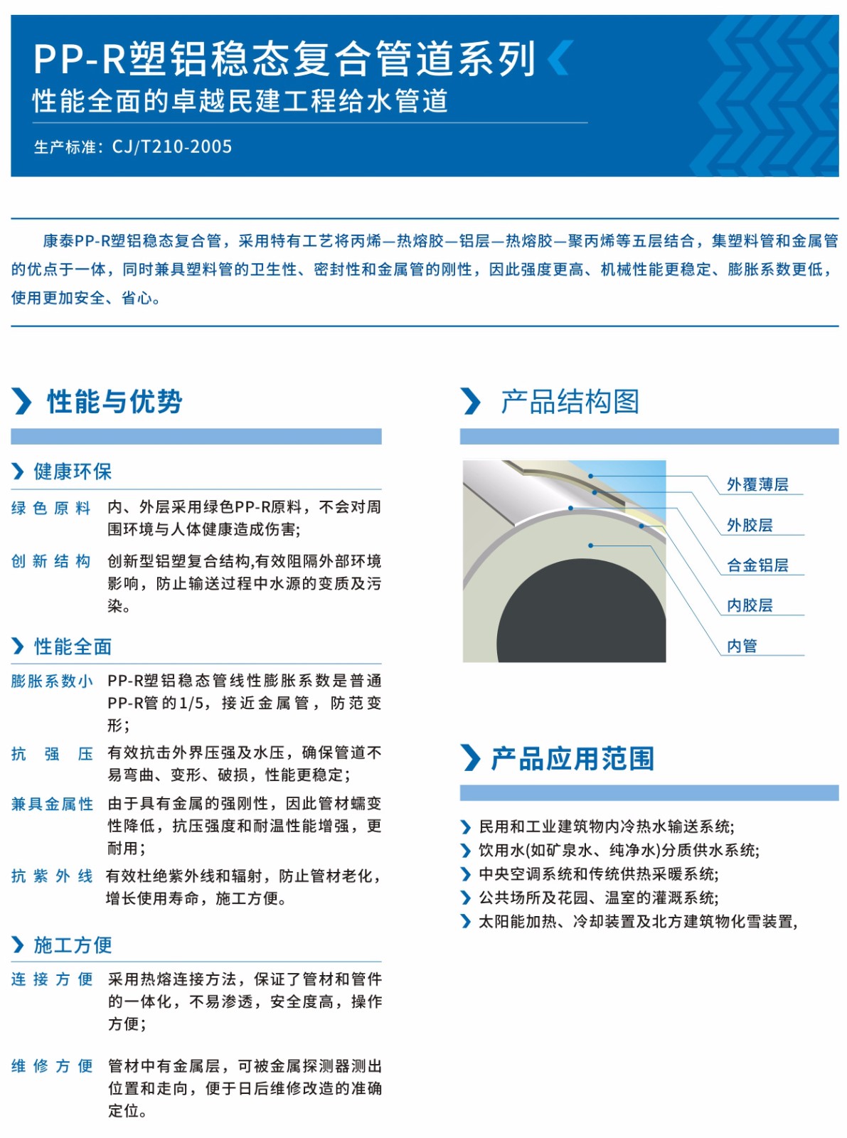 PP-R塑鋁穩(wěn)態(tài)復(fù)合管是一種五層結(jié)構(gòu)的復(fù)合管材,是將PP-R管與鋁層在高溫下通過特制熱熔膠有機(jī)結(jié)合,形成了聚丙烯—熱熔膠—鋁層—熱熔膠—聚丙烯的特殊復(fù)合結(jié)構(gòu),內(nèi)外層的PP-R材料可以保證管材在給水應(yīng)用中的衛(wèi)生性能,其中內(nèi)層PP-R尺寸接近于普通PP-R管,是主要的承壓體,而中間的鋁層起加強(qiáng)保護(hù)作用。它集塑料管和金屬管的優(yōu)點(diǎn)于一體,同時兼具塑料管的衛(wèi)生性、密封性和金屬管的剛性,具有更高的強(qiáng)度和更穩(wěn)定的機(jī)械性能,其線性膨脹系數(shù)是普通PP-R管的1/5,接近于金屬管,具有更高的穩(wěn)定性和安全性。