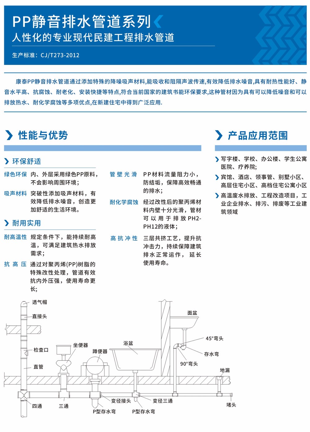 康泰牌聚丙烯靜音耐熱排水管道系統(tǒng)具有耐熱性能好、靜音水平高、抗腐蝕、耐老化、安裝快捷等特點(diǎn),既可解決普通水管不能長(zhǎng)期排放熱水的難題,又能有效的解決建筑內(nèi)管道噪音的困擾,符合當(dāng)前國(guó)家的建筑節(jié)能環(huán)保要求。這種管材因?yàn)榫哂锌梢越档驮胍艉涂梢耘欧艧崴?、耐化學(xué)腐蝕等多項(xiàng)優(yōu)點(diǎn),在新建住宅中得到廣泛應(yīng)用。